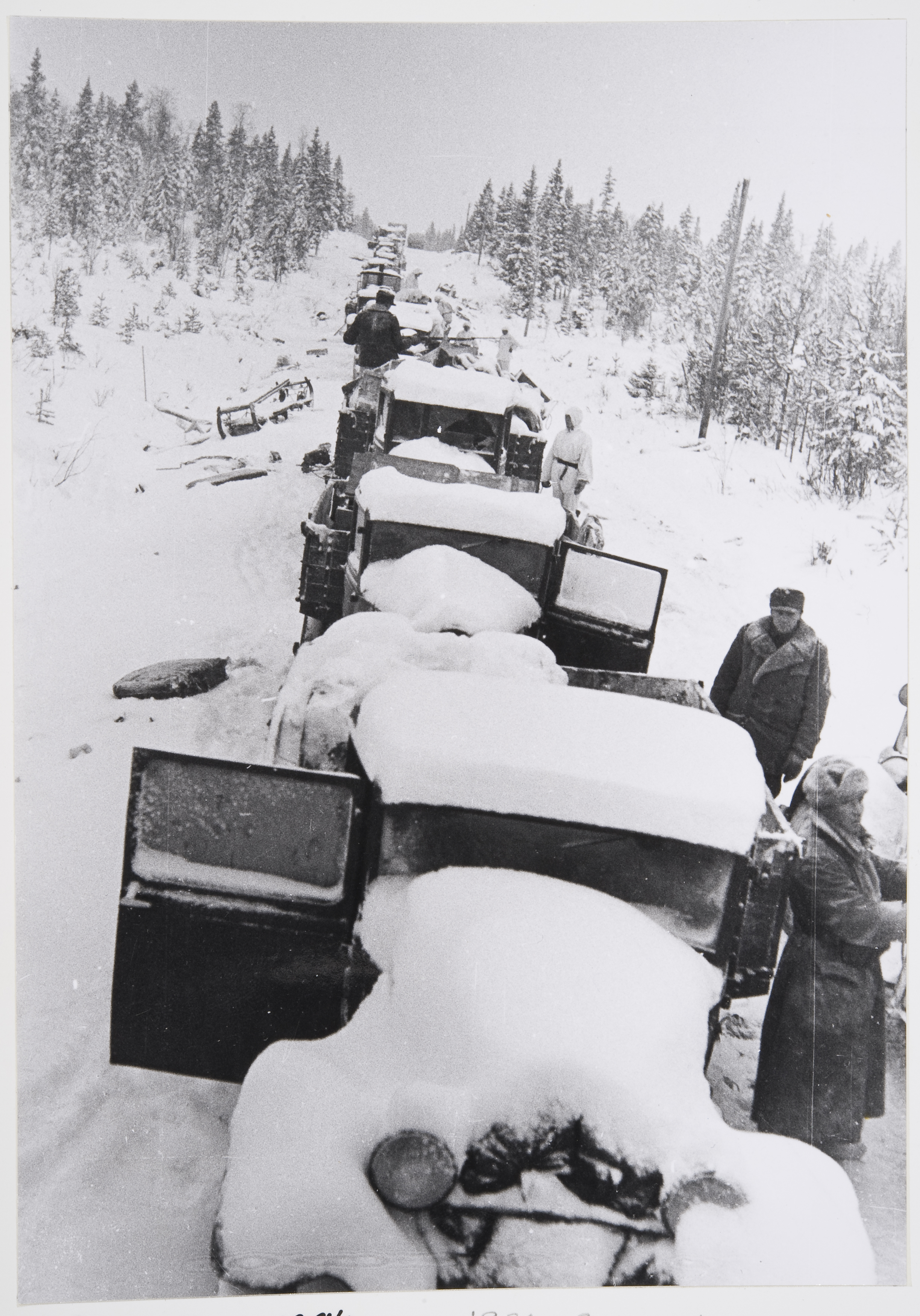 Suomalaisten pysäyttämä puna-armeijan autokolonna Raatteen tiellä vuonna 1940.